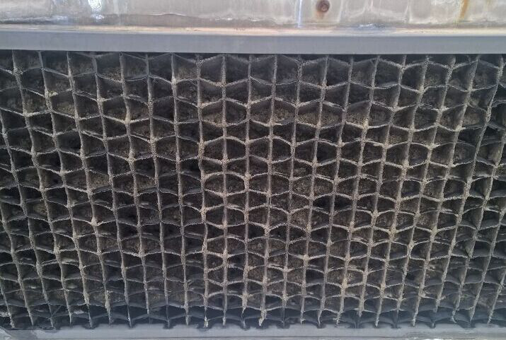 3、 將填料拆下來,首先用高壓水槍反復(fù)沖洗填料,清除表面污泥水垢等;
